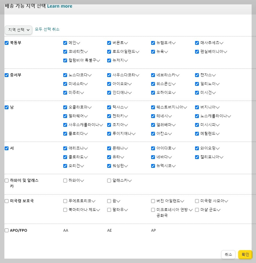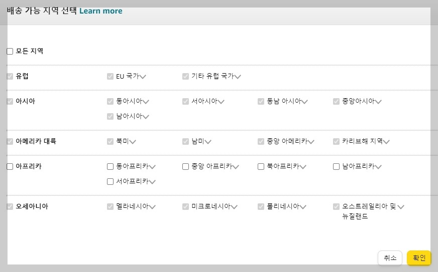 위와 같이 아프리카를 제외하고 배송 가능 지역을 선택할 수 있습니다.
