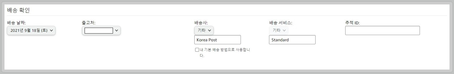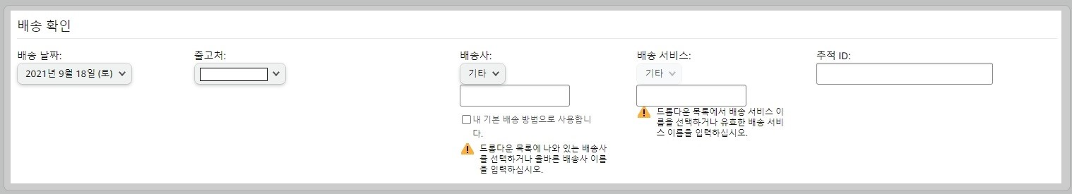 배송 날짜와 출고처(셀러)는 자동 입력되고 배송사, 배송 서비스, 추적 ID를 입력해야 합니다.