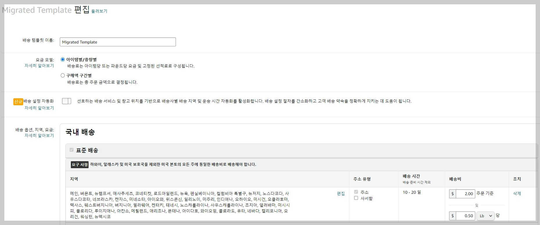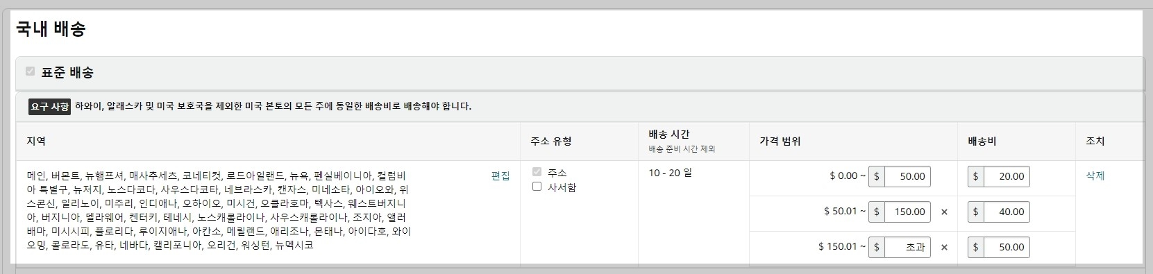 빠른 배송은 선택사항으로 표준 배송만도 설정할 수 있습니다. 템플릿을 추가해서 표준 배송 제품과 빠른 배송 제품을 나누어 진행해 볼 수 있겠습니다. 빠른 배송도 표준 배송과 마찬가지로 주문 기존 + 아이템당 또는 Lb당(무게) 배송비를 설정할 수 있습니다.