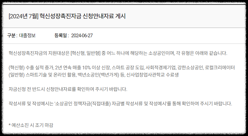 2일 전에 소상공인 혁신성장촉진자금에 관련된 글을 작성했는데요. 아니나 다를까, 바로 어제 공지사항이 소상공인정책자금 사이트에 나왔습니다.