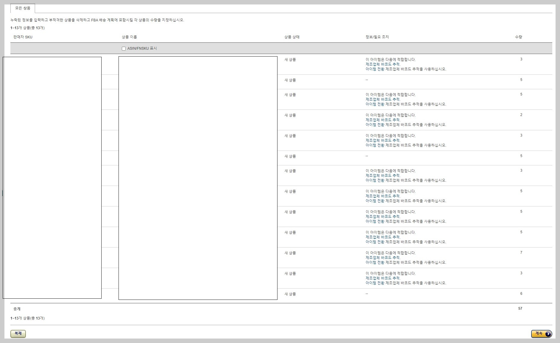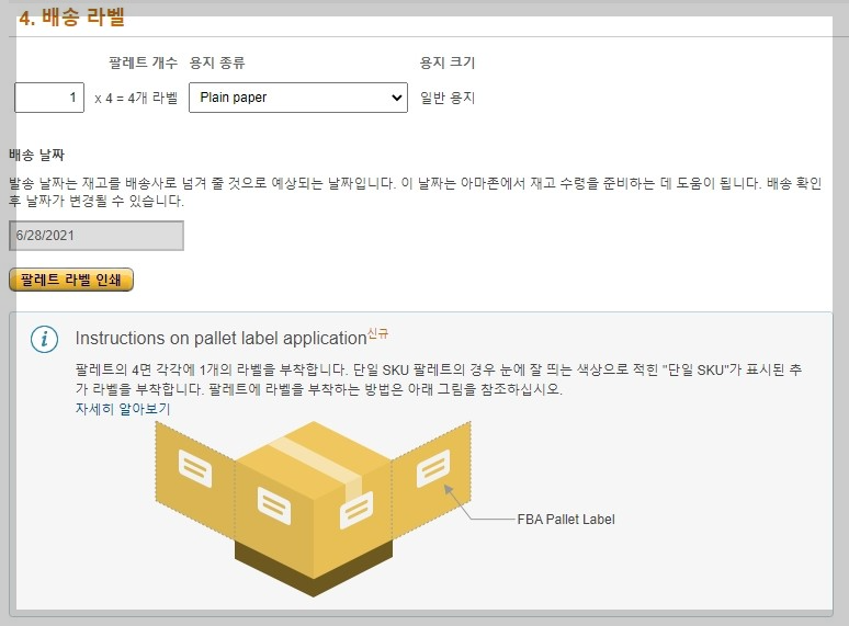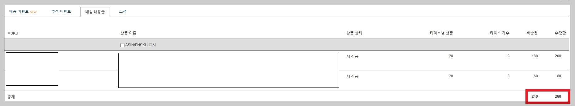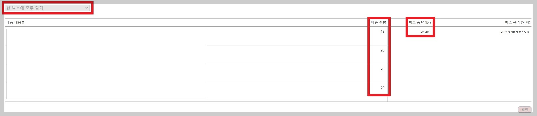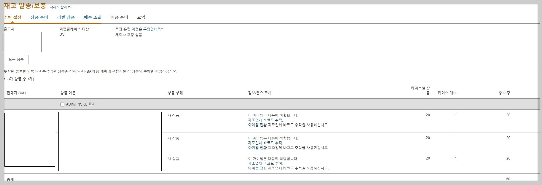 1개의 아마존 창고로 혼적 화물 운송(LTL) 배송 방법으로 팔레트로 입고시켰습니다. 이슈가 있습니다. 240개의 제품을 발송했는데 수령 수량은 260개로 나옵니다. 박스당 무게 입력란이 없습니다. 팔레트 라벨도 필요합니다.