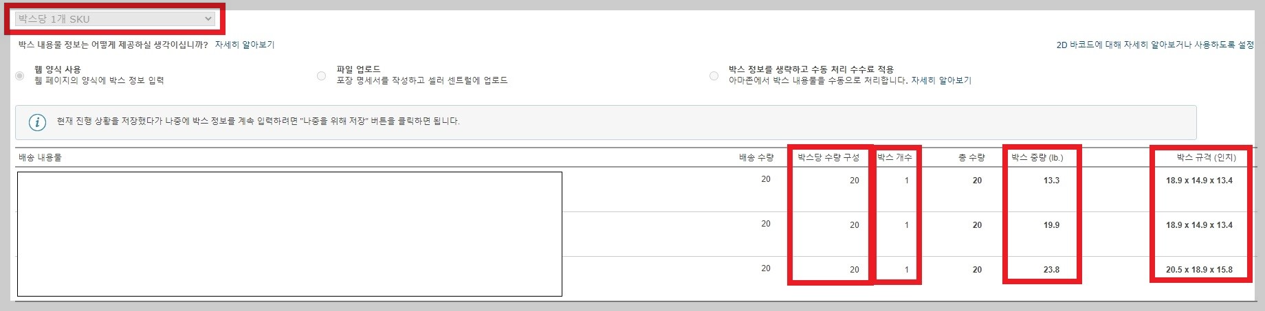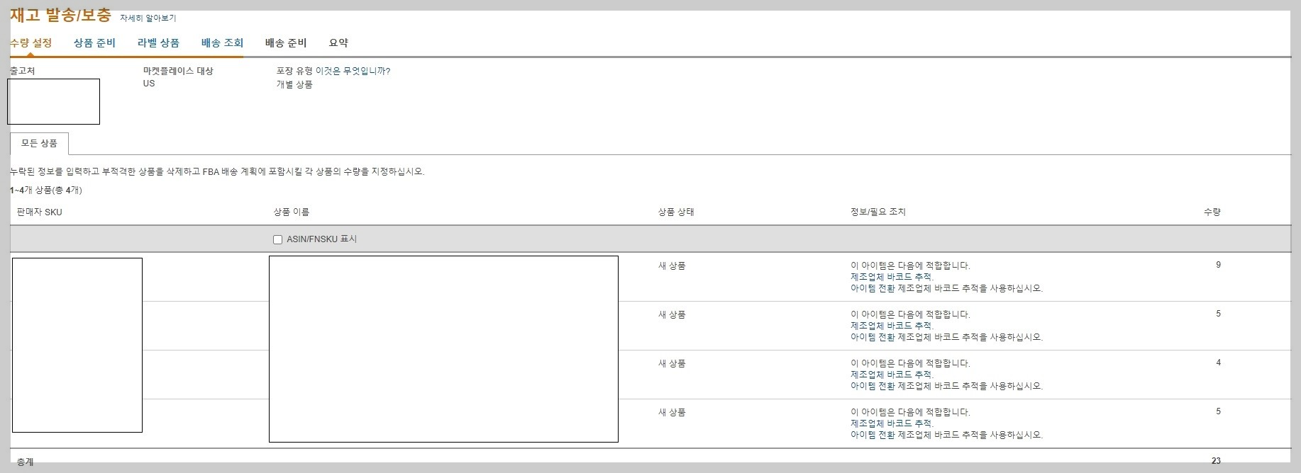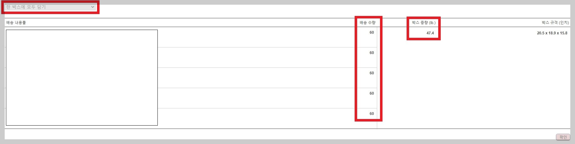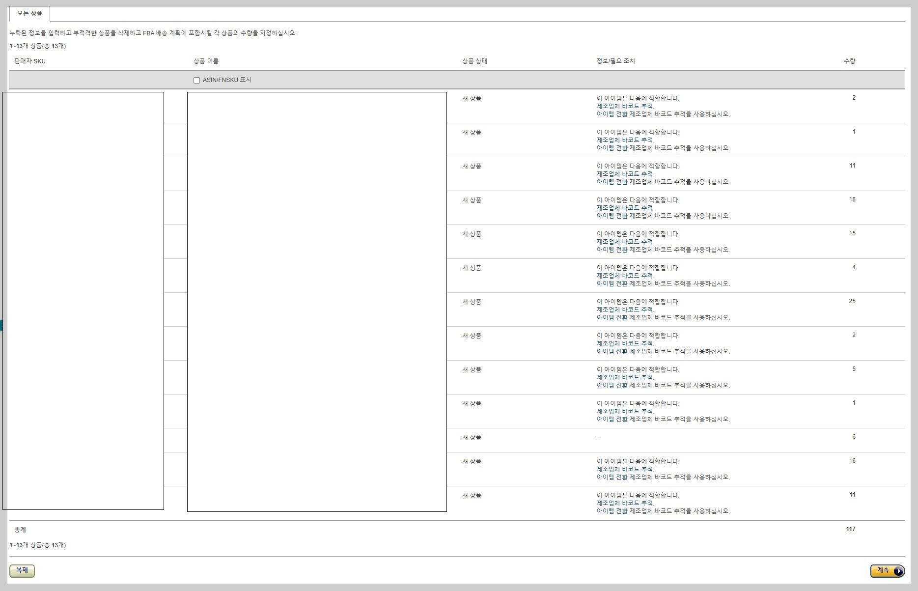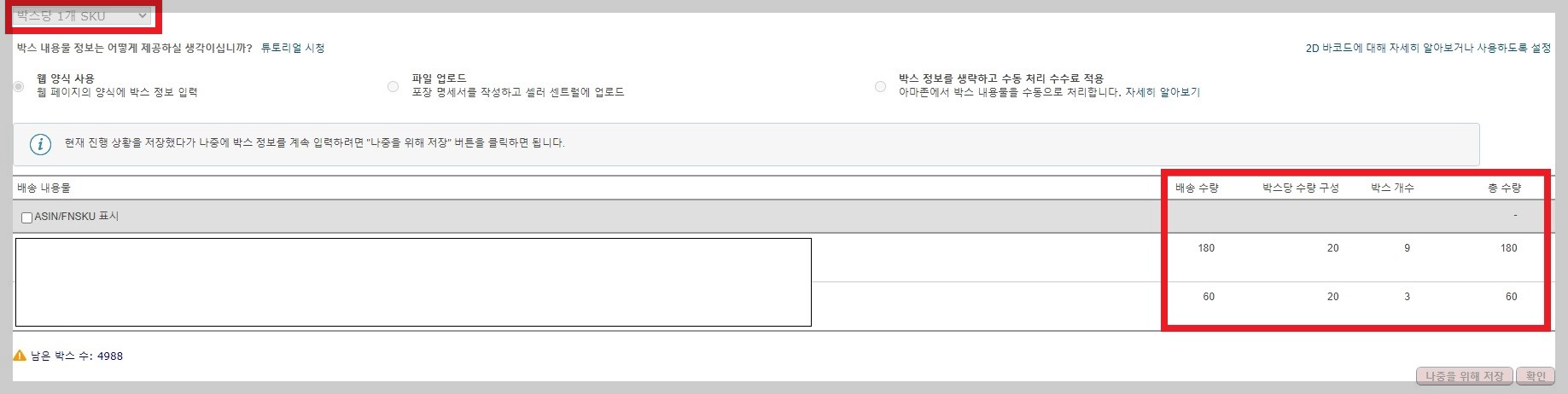 1개의 아마존 창고로 혼적 화물 운송(LTL) 배송 방법으로 팔레트로 입고시켰습니다. 이슈가 있습니다. 240개의 제품을 발송했는데 수령 수량은 260개로 나옵니다. 박스당 무게 입력란이 없습니다. 팔레트 라벨도 필요합니다.