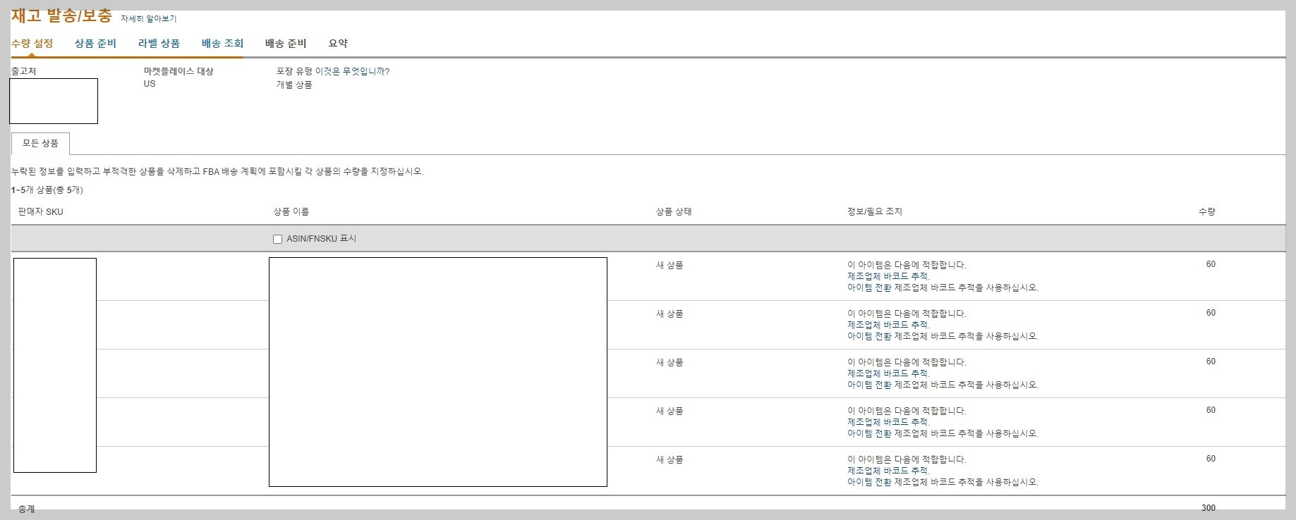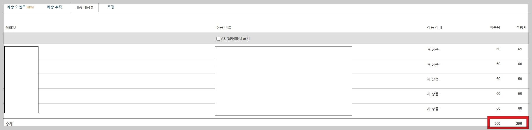 1개의 아마존 창고로 정해졌고 아마존 협력 배송사 UPS를 이용하여 입고시켰습니다. 이슈가 있습니다. 마지막 이미지 배송 내용물의 총입고 재고를 보면 296개로 발송 재고 300개와 수령 숫자가 다릅니다.