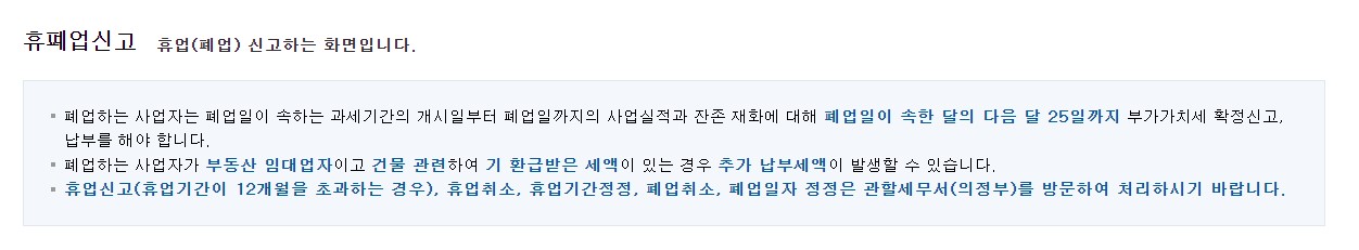 국세증명ㆍ사업자등록ㆍ세금관련 신청/신고 > 사업자등록 신청·정정·휴폐업 > 휴·폐업·재개업 신고 > 휴업·폐업 신고