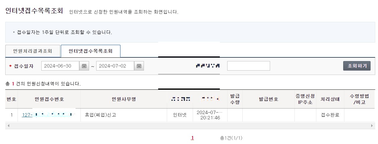 혹시 몰라서 접수목록조회를 해보니 이렇게 접수 신청이 나타납니다. 폐업신고 확인서 등 서류 관련 전산 업데이트는 30분 정도는 경과해야 한다고 안내 문구가 나옵니다. 뭐, 하루이틀 정도 기다리면 되지 않겠습니다. 폐업하는 날에는 많은 준비가 필요하지 않음을 알 수가 있네요.