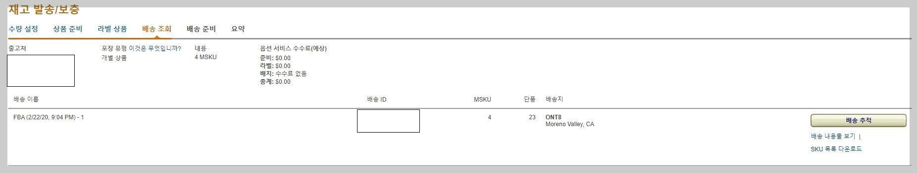 운이 좋은 경우입니다. 1개의 아마존 창고로 정해졌고 아마존 협력 배송사 UPS를 이용하여 입고시켰습니다.