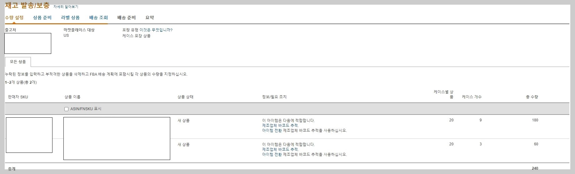 1개의 아마존 창고로 혼적 화물 운송(LTL) 배송 방법으로 팔레트로 입고시켰습니다. 이슈가 있습니다. 240개의 제품을 발송했는데 수령 수량은 260개로 나옵니다. 박스당 무게 입력란이 없습니다. 팔레트 라벨도 필요합니다.